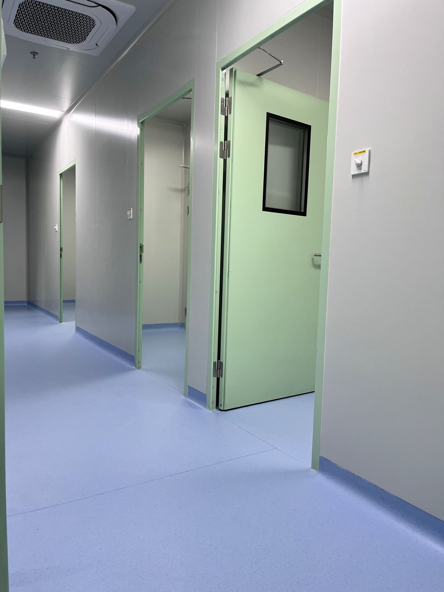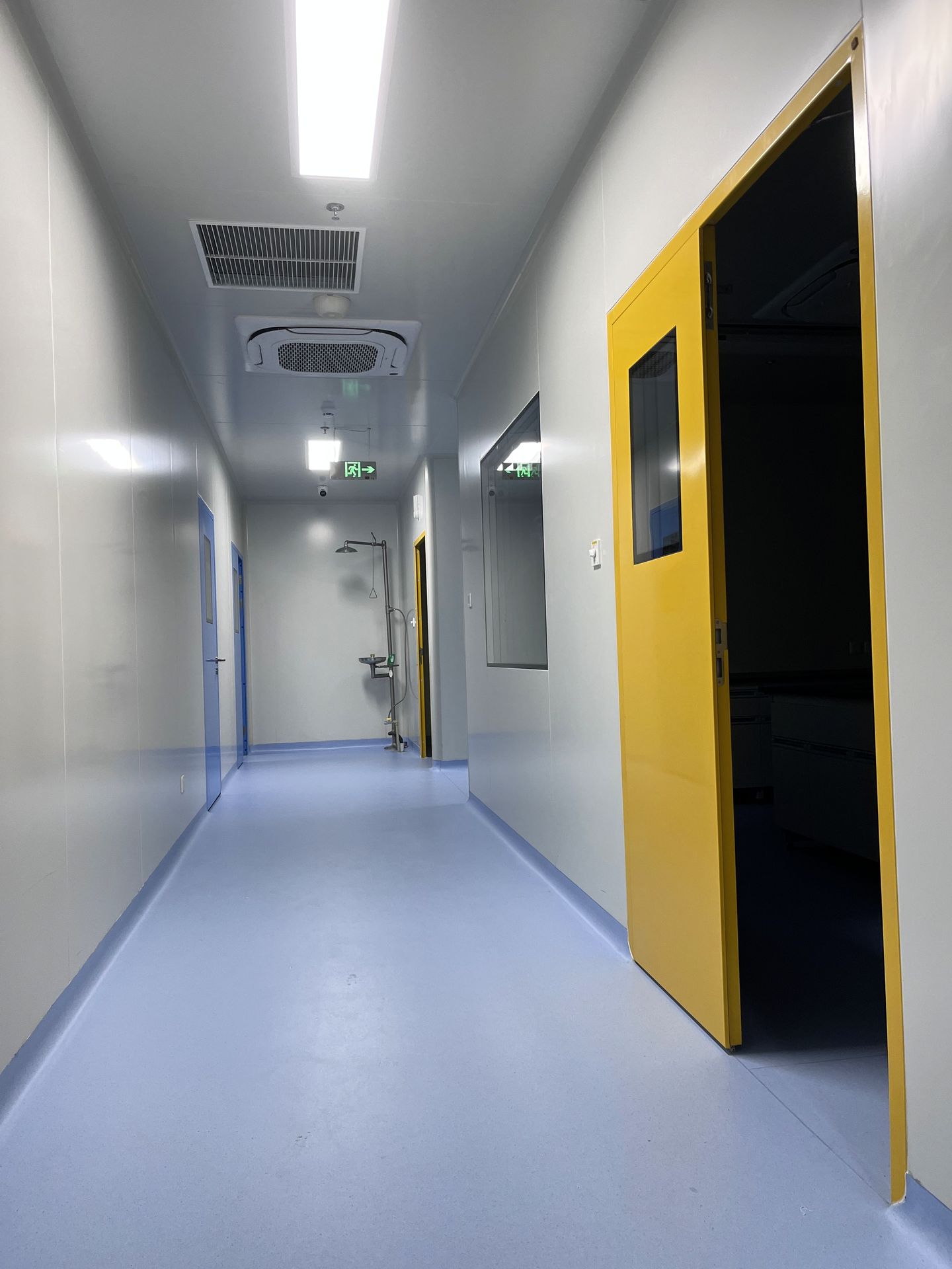 定制化潔凈門窗與圍護系統(tǒng)嚴絲合縫,氣密性優(yōu)異的凈化門搭配固定觀察窗,既保障了實驗室內(nèi)部的潔凈壓差,也兼顧了通行安全與空間觀察需求,黃色與淺綠色的分區(qū)設計,更實現(xiàn)了不同功能區(qū)域的清晰劃分。